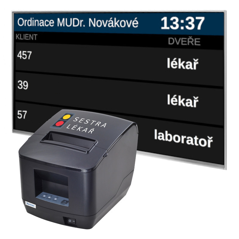 Příchozí klient přijde do čekárny, na dotykovém panelu vybere důvod své návštěvy, obdrží lístek s pořadovým číslem a posadí se.